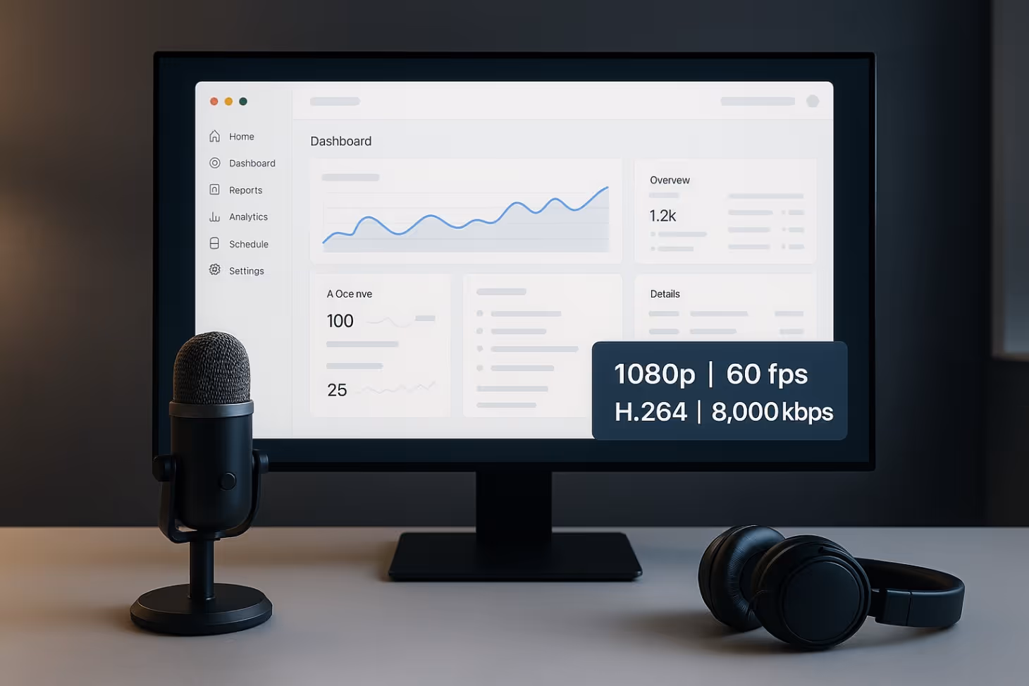 Screen UIs break easily on social feeds and big displays when you under-record. Capture at least 1080p with a constant frame rate and a healthy bitrate so text and micro-interactions stay crisp. Established guidance for web delivery recommends H.264 in an MP4 container, constant 15 to 60 fps, and roughly 5,000 to 8,000 kbps for 1080p masters, with higher ceilings for 4K. If you are publishing to YouTube, follow the platform’s encoding recommendations so your upload transcodes cleanly and preserves UI detail. Plan clean cursor moves, intentional zooms, consistent lower thirds, and a treated voice track recorded on a decent mic in a controlled room.