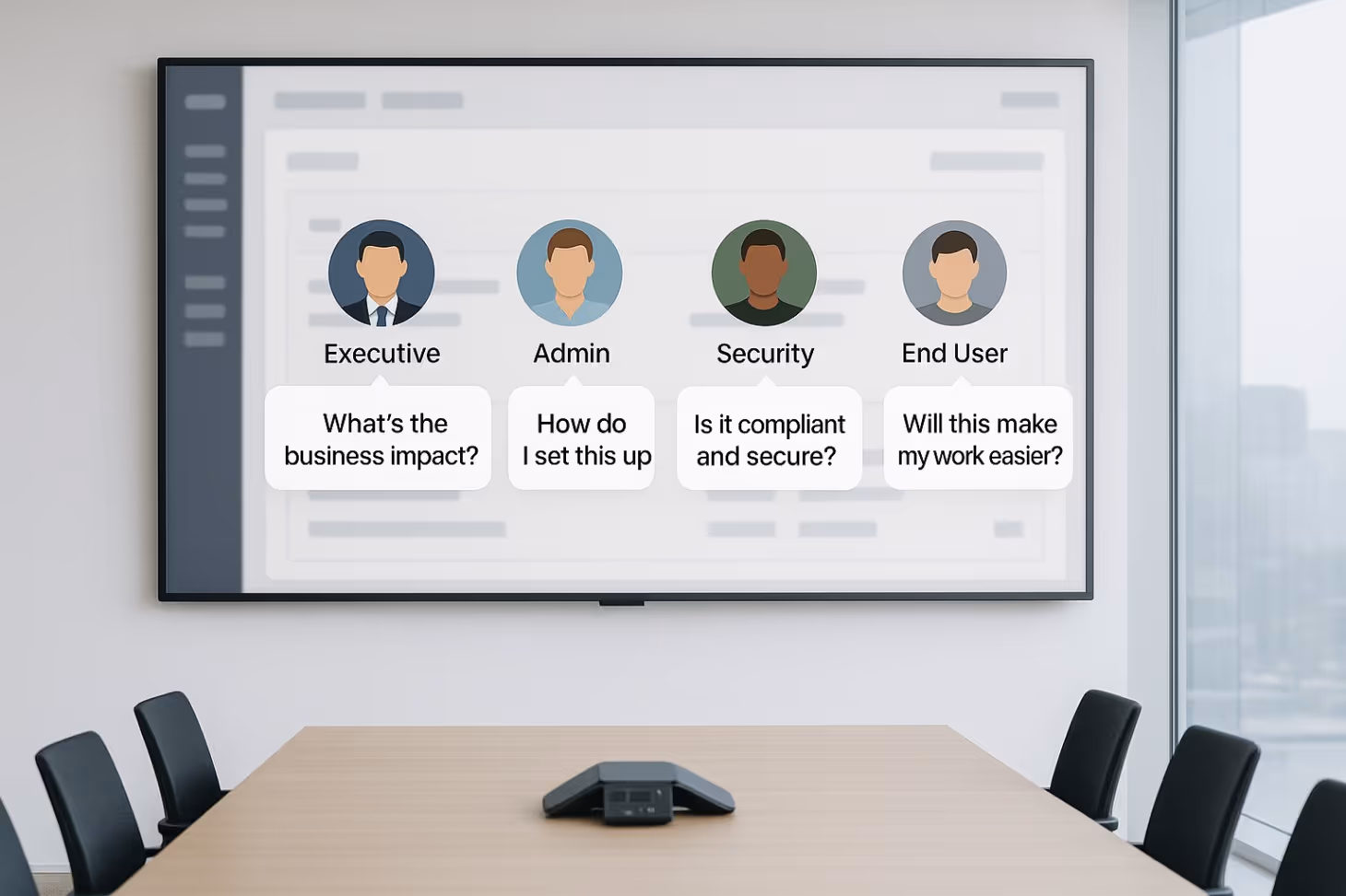 One product, many buyers. In most enterprise deals you are addressing a committee, not a person. Executives want a crisp business reason to care. Admins need to picture the set-up. Security wants proof you will not create risk. End users need to feel the workflow is simple. Plan the core story for everyone, then decide which roles deserve their own cut-downs and which can be handled with chapters on a single deep-dive. As a rule of thumb, expect half a dozen or more stakeholders to weigh in on a purchase, which is why role-aware variants pay off.