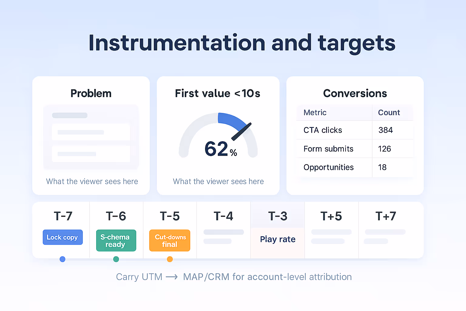 Set targets for play rate, and for 25, 50, 75 and 100 per cent view quartiles. Fire events on CTA clicks and form submits, and carry UTM parameters into your CRM so sales can see which accounts actually watched. If your player supports in-video lead capture, place the form between the middle and the final quarter of a one to three-minute video where conversion tends to peak. Wistia and Vidyard both document the mechanics and the benchmarks for where in-player forms perform best and how to pass data to your MAP and CRM.